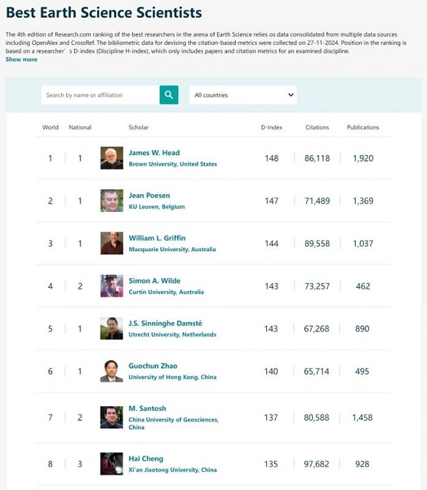 Professor Cheng ranks 8th globally and 3rd in China (1st among Chinese mainland scholars), earning the 2025 Earth Science Leadership Award for his groundbreaking contributions.